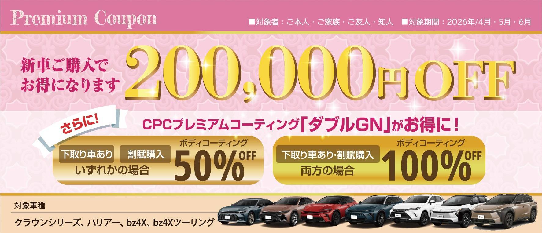 【新車】4-6月!新車がとってもお得に買える!ご来店の方にプレミアムクーポン配布中!
