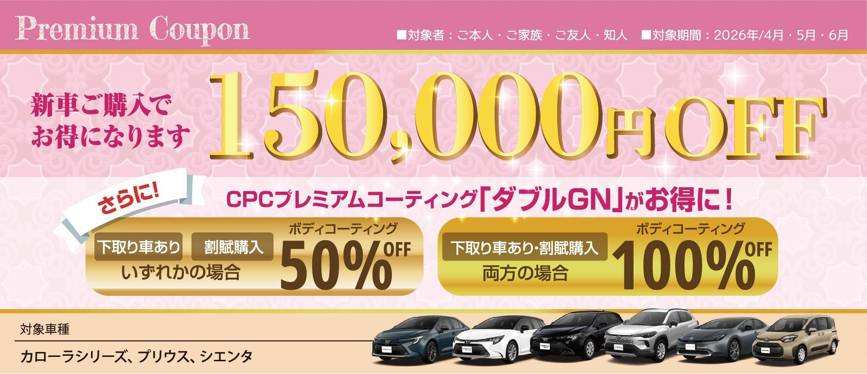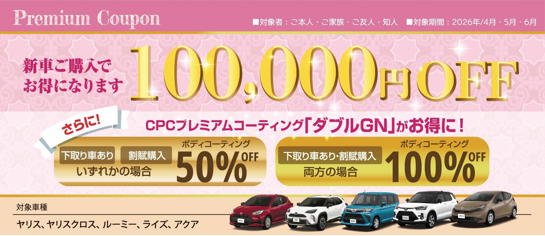 期間中、対象の新車をご購入の際にクーポンご利用で